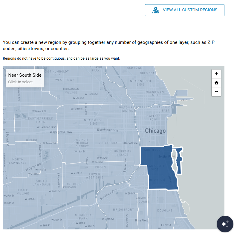 A Custom Region is a specific geography you define, such as a service area or part of a state. When you create a Custom Region, you can select it with any visualization, and data will be populated for it.