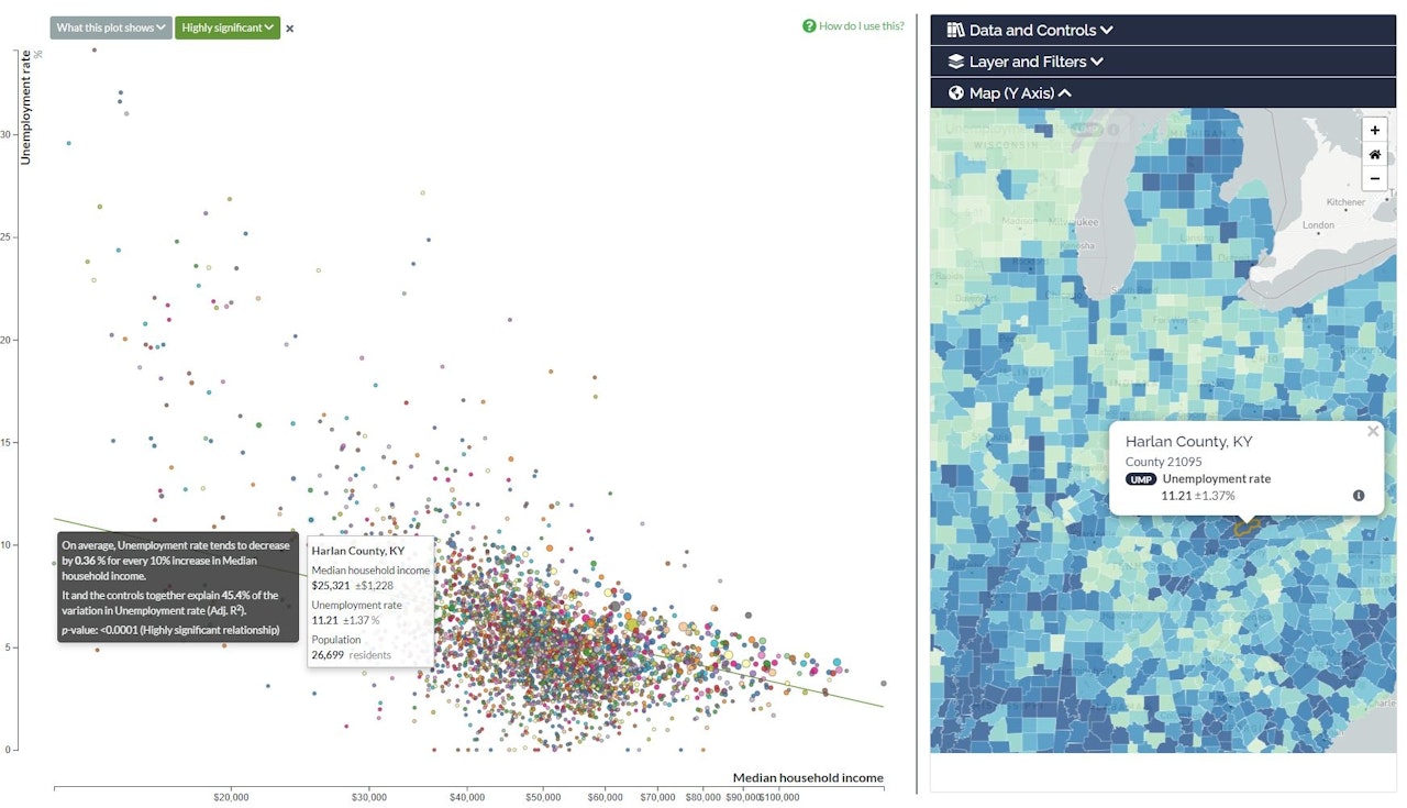 The scatterplot shows how values of one topic tend to correlate with (increase or decrease at the same time as) values of another topic, among a group of places.