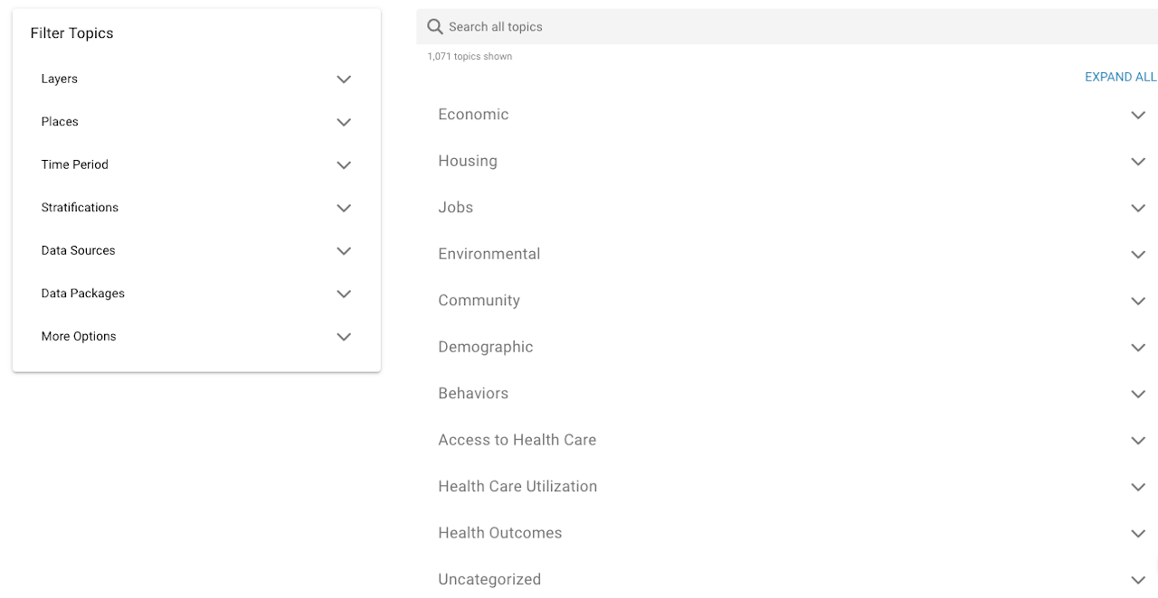 From the Data Dictionary, you can use the search bar, view by theme, or Filter Topics to search for specific criteria.