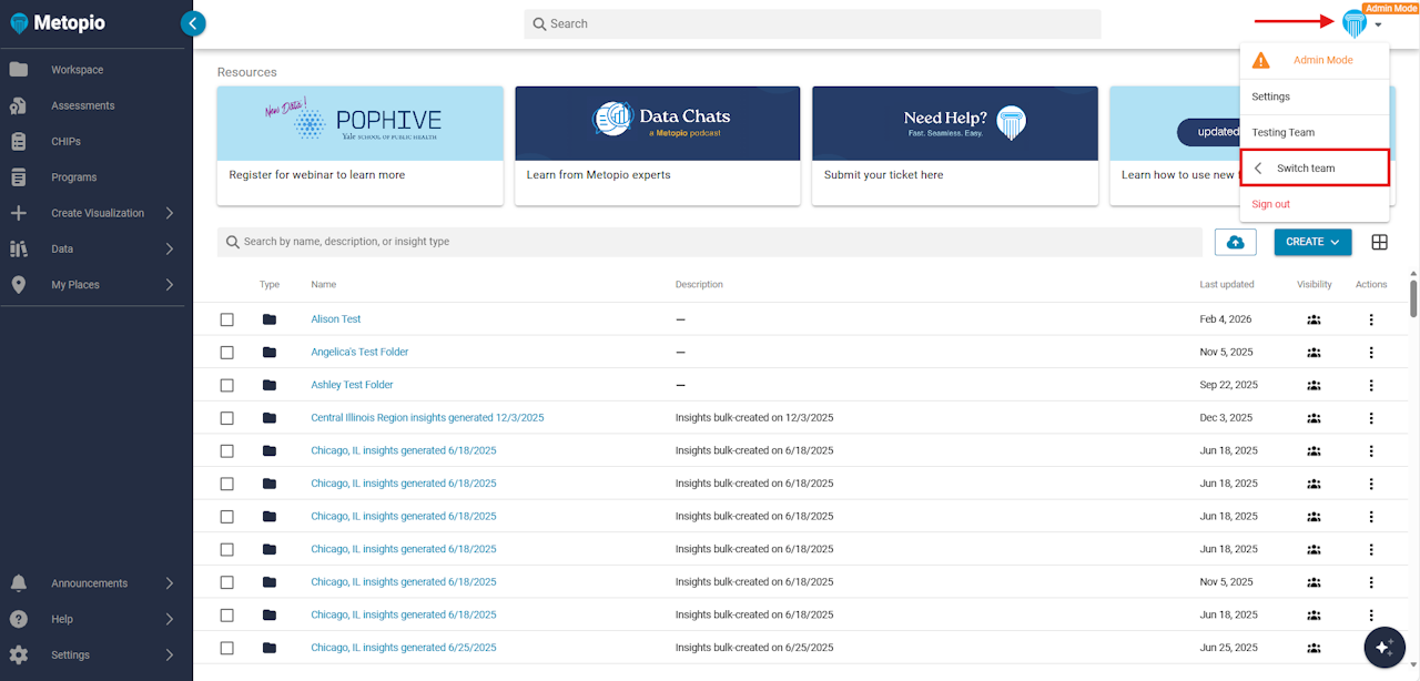 Hover your mouse over Switch Teams, then select the name of the Team you want to associate with