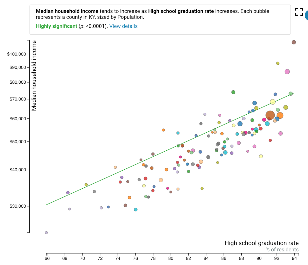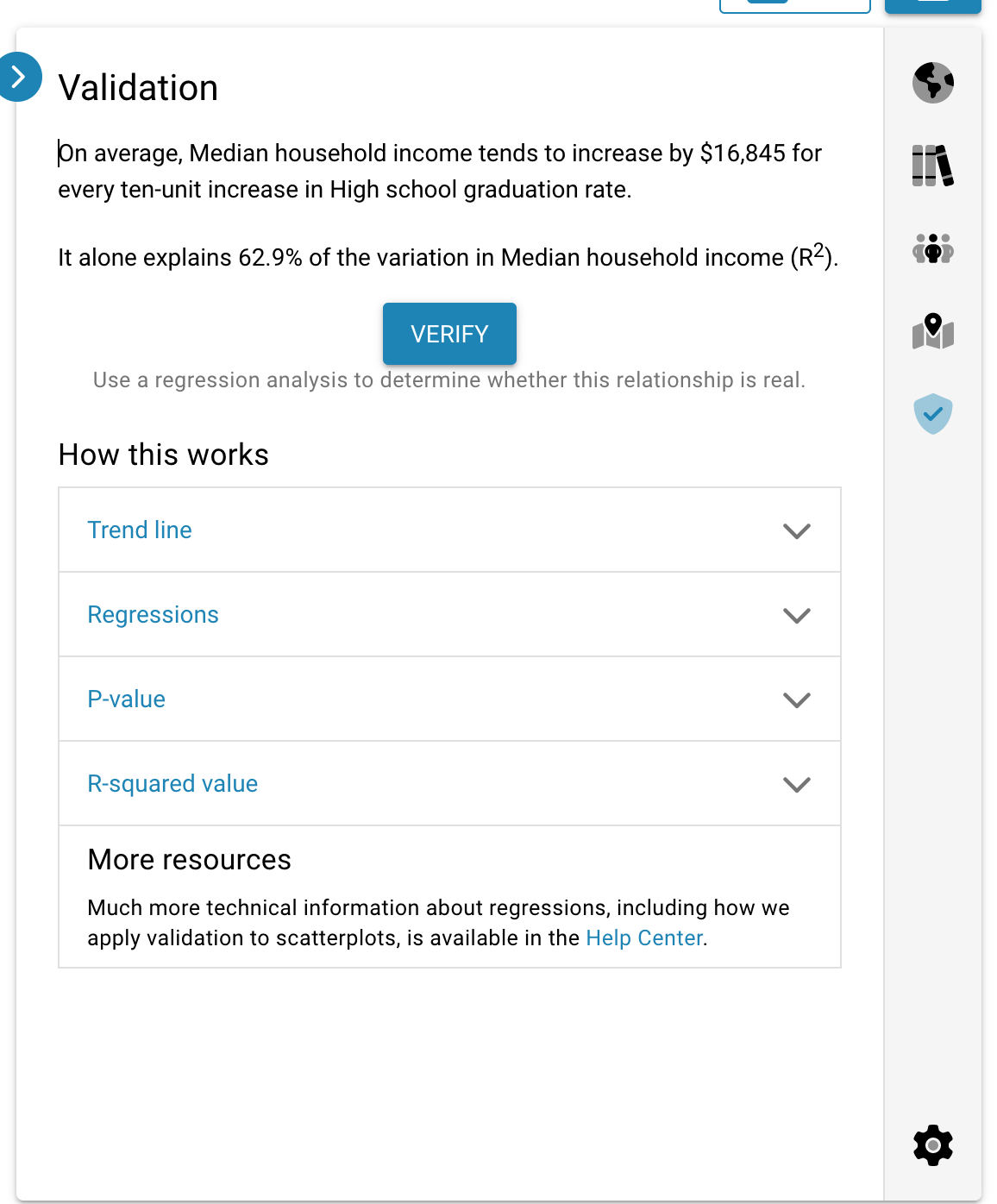Click the Verify button to test the relationship between the X and Y axes using a controlled multi-variable regression. Effectively, this removes some commonly related factors from the equation, including demographics, income, and education. Click on the button after running the verification to learn more about the results.