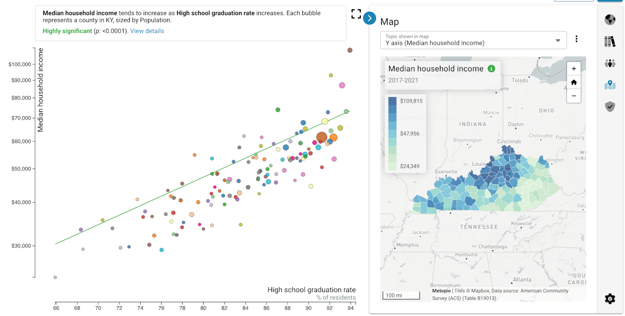There is a map connected to this scatterplot showing data from the topic on the Y (vertical) axis. Hover over a bubble to see which place it is, or click the bubble to find it in the map connected to this scatterplot. You can also use the map to locate places in the scatterplot.